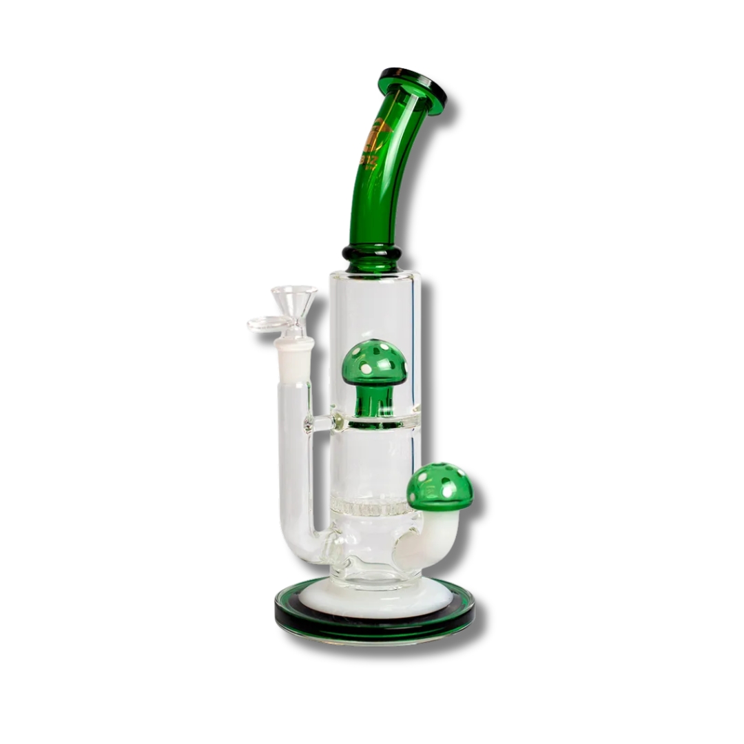O Bong de Vidro Abduzido Gold Line Mushroom transporta sua sessão para um novo nível de estilo. Com um design temático de cogumelos e o refinado acabamento na cor verde da linha Gold, esta peça de tamanho grande une a estética da natureza com a sofisticação do vidro premium. É o acessório perfeito para quem busca tragadas potentes e um visual que se destaca em qualquer coleção.